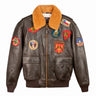 THE OFFICIAL TOP GUN G-1 flight jacket acknowledges the service history of the Navy's elite fighter pilots. This jacket is made of 100% supple antique lambskin with a bi-swing back and removable mouton fur collar. This jacket showcases a Blood Chit on its back, containing a rescue message in four different languages alongside the United States flag. This message seeks aid from local civilians in the event of being injured or stranded and promises a reward for their assistance. Blood Chits were used as a form of insurance for military personnel, its origins date back to World War II and earlier conflicts.