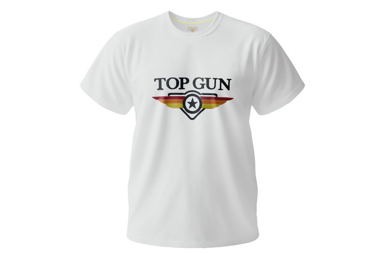This is a clean, white Top Gun t-shirt featuring a classic, bold graphic. The design includes the "TOP GUN" logo above a stylized shield and wing emblem with stripes of orange, yellow, and red. A star is featured in the center of the emblem. This simple and iconic design makes it a versatile piece for any fan.